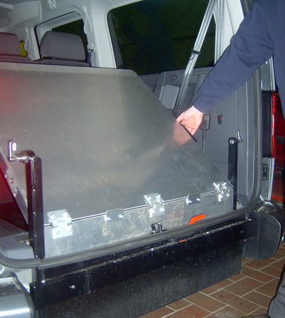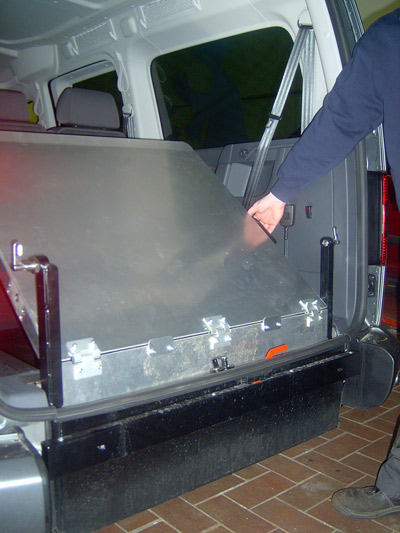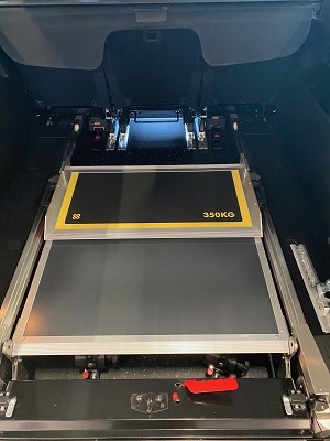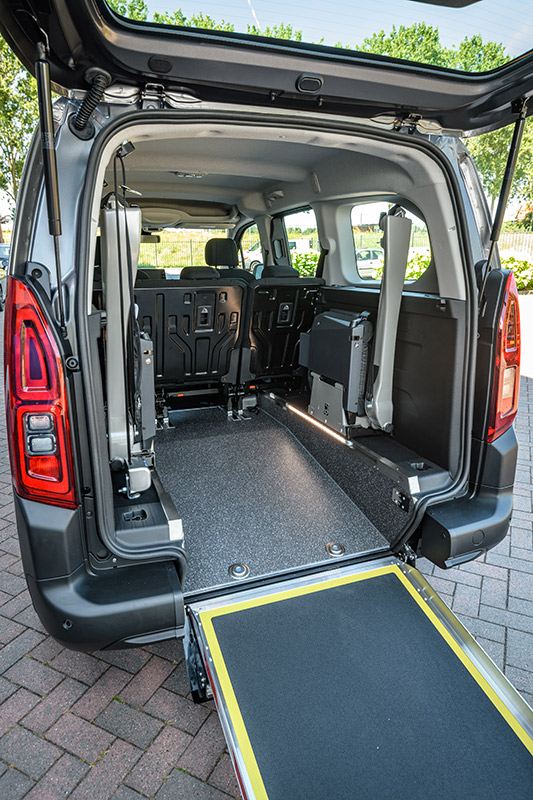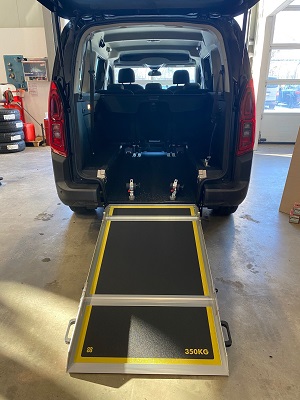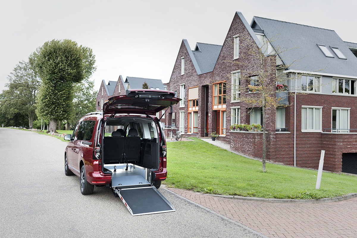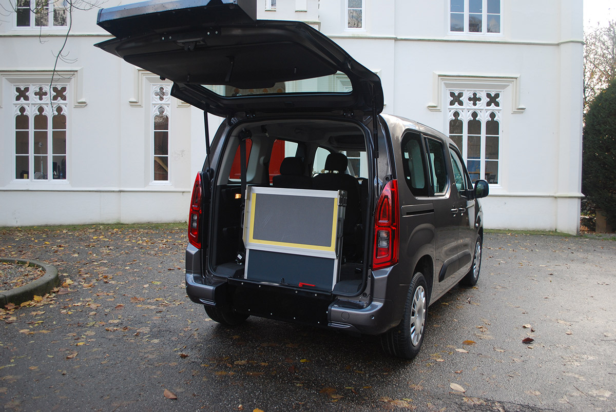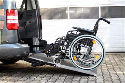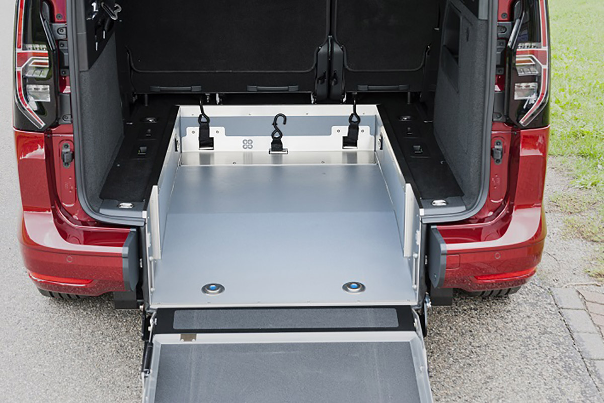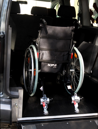 Rollstuhl- und Personenrückhaltesystem beinhaltet elektrisch schaltbare Gurte (4-Punkt Rollstuhlbefestigung) sowie einen Schrägschulterautomatikgurt zum sicheren Transport des Rollstuhlfahrers. Der tiefer liegende Boden wird mit PVC und Edelstahl Verkleidung versehen. Die Aluminium-Auffahrrampe 1210 mm x 800 mm wird zum Rollstuhl-Transport hochgeklappt oder durch die Einklappfunktion platzsparend auf den Fahrzeugboden geklappt. Der Stoßfänger wird geteilt und mit Endkappen versehen, so dass der Heckausschnitt bei geschlossener Klappe kaum sichtbar ist. Das Rückfahrwarnsystem bleibt selbstverständlich erhalten.